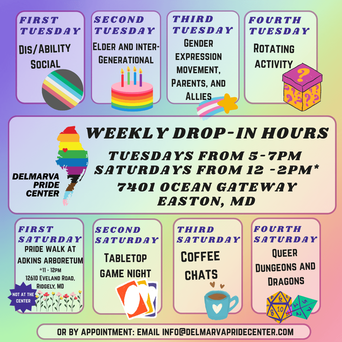 The Delmarva Pride Center is a community service organization dedicated to creating a positive environment inclusive of all sexual orientations and gender identities. We support, educate, connect, organize, and provide outreach to the Delmarva LGBTQ+ community and its allies.Vision: